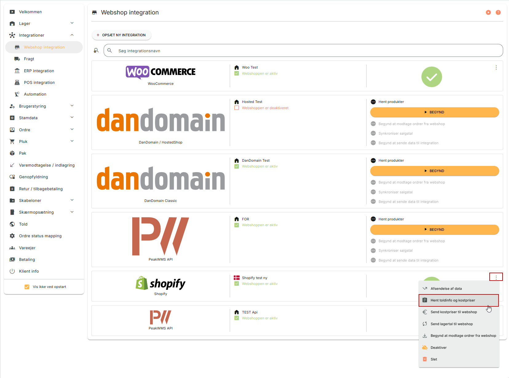 Bruger du Shopify, har du mulighed for at angive f.eks. vægt, oprindelsesland og toldtarif på produkterne i Shopify. Her er det dog nødvendigt, at du efterfølgende henter informationerne ind i PeakWMS, for at PeakWMS kan bruge informationerne. Dette gøres under Indstillinger > Integrationer > Webshop integration, ved at klikke på tre prik menuen for webshopintegrationen, og vælge "Hent toldinfo og kostpriser".