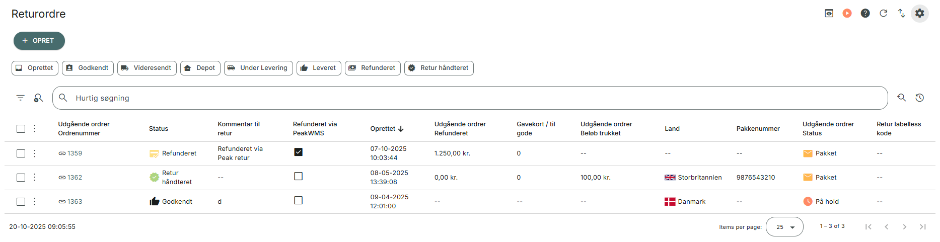 Under returordrer finder du et overblik over alle de returordrer, der er blevet registreret i PeakWMS. Det gælder både returordrer, der er oprettet direkte via PeakWMS' returportal, retur, der er kørt igennem PeakWMS' retur/tilbagebetaling udenom returportalen, samt returordrer oprettet via 3 parts systemer som Returnflows og Reversio.