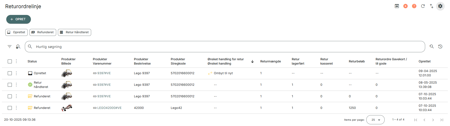 I Returordrelinjer, finder du en dialog, hvor du kan skabe overblik over alle de returlinjer, der er registreret i PeakWMS. Du kan se alle returordrelinjer i dialogen, hvad end de er håndteret eller ej.