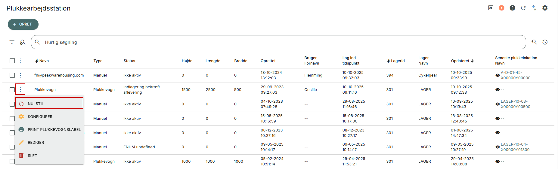 I dialogen har du også mulighed for at nulstille dine plukkearbejdsstationer. Dette gøres ved at klikke på tre prik menuen ud for en plukkearbejdsstation.