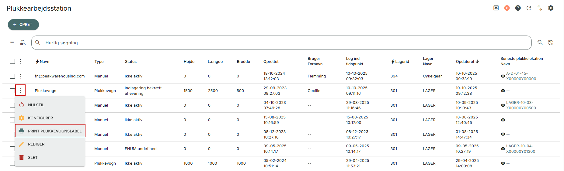 Du har også mulighed for at printe plukkevognslabel til din plukkevogn i dialogen. Dette gøres ved at klikke på tre prik menuen og vælge "Print plukkevognslabel". Knappen printer en label til selve plukkevognen, som kan scannes, når plukkevogn skal vælges i plukkeprocessen.
