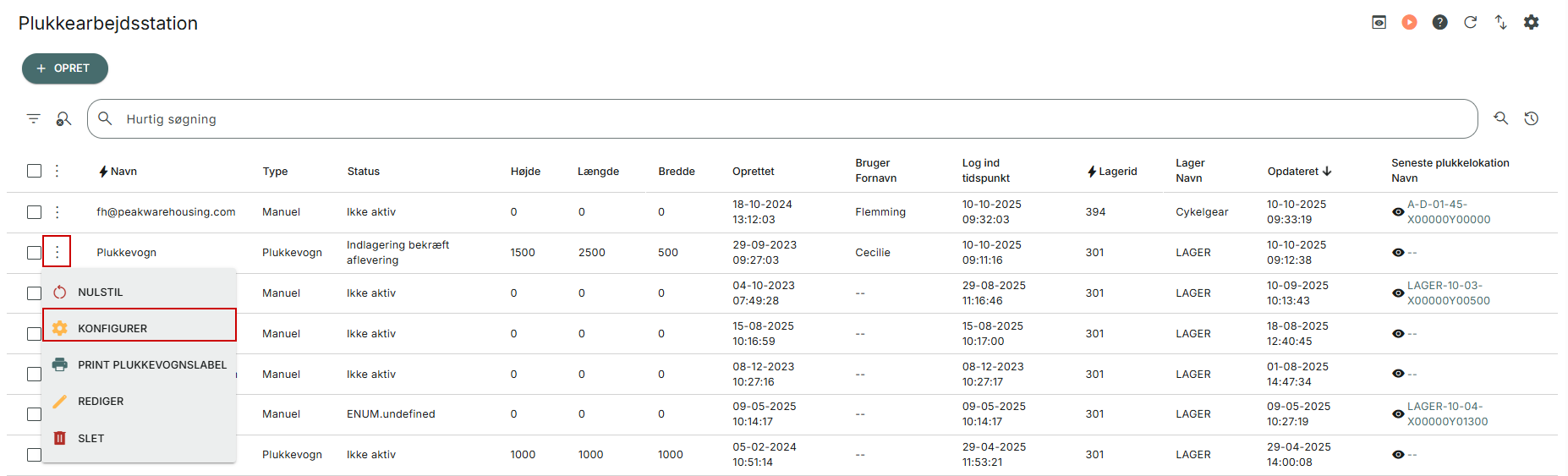 Du kan konfigurere din plukkevogn. Dette gøres ved at klikke på tre prik menuen ud for plukkearbejdsstationen, og vælge "Konfigurér". Vælges denne, vil du kunne ændre i plukkevognen mål og opbygning.