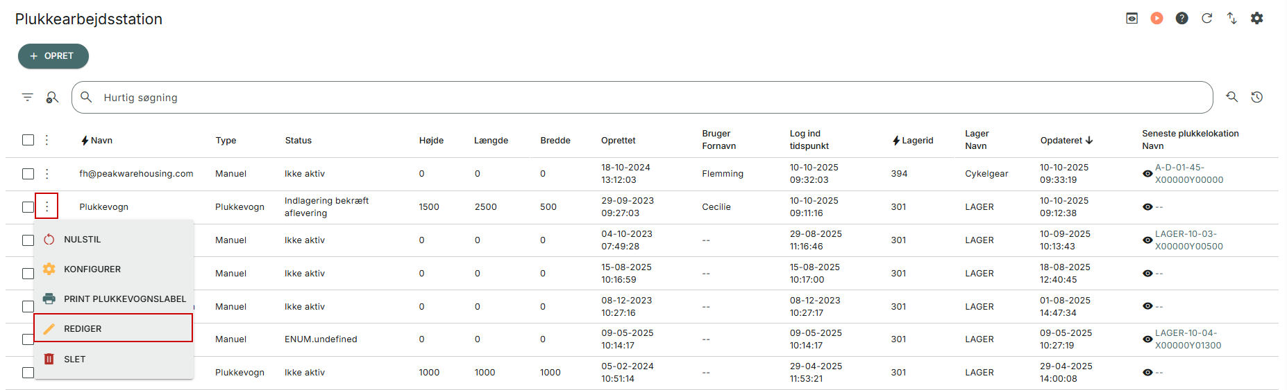 Du kan redigére en plukkearbejdsstation fra overblikket. Dette gøres ved at klikke på tre prik menuen ud for plukkearbejdsstationen og vælge "Redigér". Her har du mulighed for at ændre status på plukkearbejdsstationen, samt ændre navn åp arbejdsstationen.4