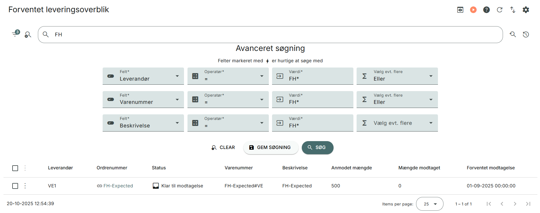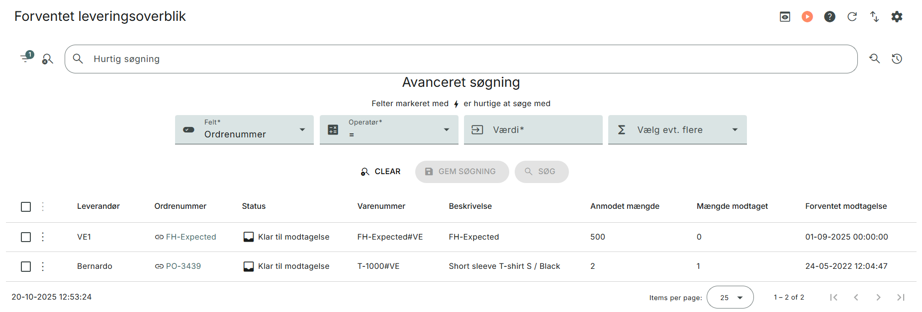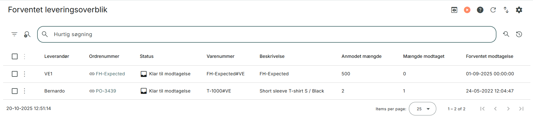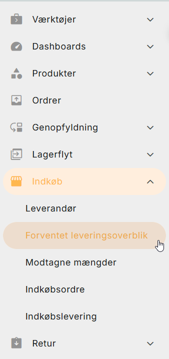 Du finder en oversigt over linjer, der ikke er modtaget inden forventet levering under Indkøb > Forventet leveringsoverblik.
