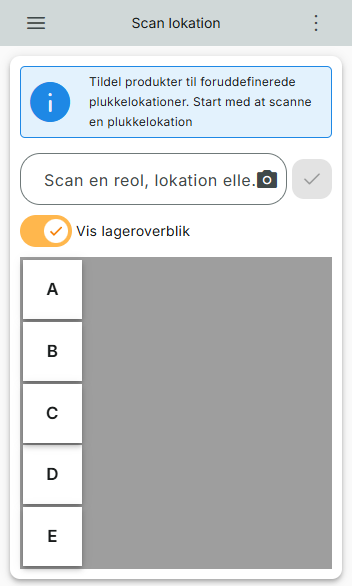 Herefter vælger du en lokation på dit lager, som du vil tildele til et produkt. Du kan enten vælge i animationen af lageret i overblikket, eller du kan scanne en lokation i dialogen.