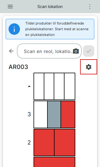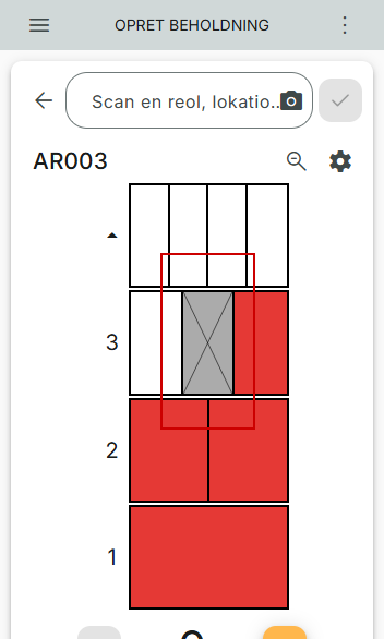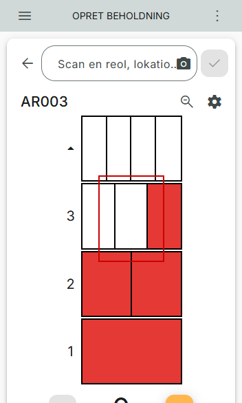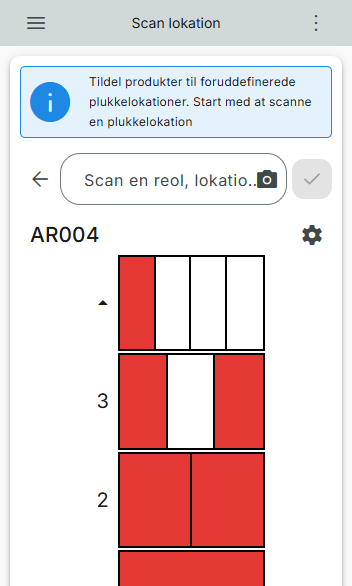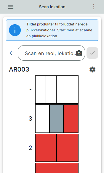 Scanner du en reol, får du vist alle lokationer i reolen. Lokationer markeret med rød er optaget. Lokationer markeret med hvid er tomme.