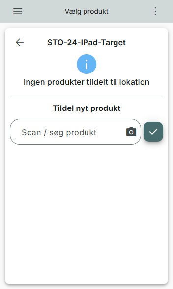 Når du vælger en lokation i reolen, skal du efterfølgende vælge det produkt, som du vil dele til lokationen. Dette kan gøres ved at scanne stregkoden på produktet. Du kan søge vha. stregkode og varenummer. Matcher flere produkter din søgning, vil du få vist en liste over produkter, som du kan vælge imellem.