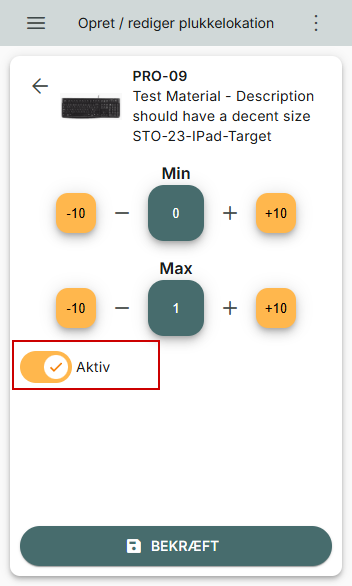 Du kan angive, om den faste plukkelokation skal være aktiv eller ej. Dette gøres ved at tilføje eller fjerne markeringen på togglen "Aktiv".