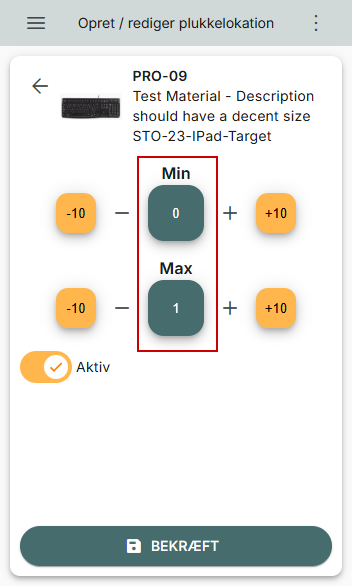 Når du har valgt et produkt, skal du angive, min og max mængde, der kan være på lokationen. Antallet skal afspejle, det minimum antal varer du vil have liggende på lokationen, inden en genopfyldningsopgave oprettes på varen.