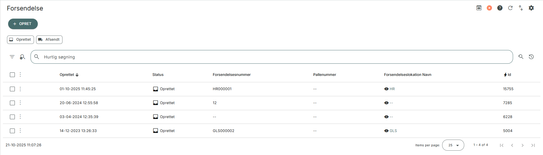 Alle forsendelser, både åbne og lukkede, er synlige under menupunktet Forsendelse.