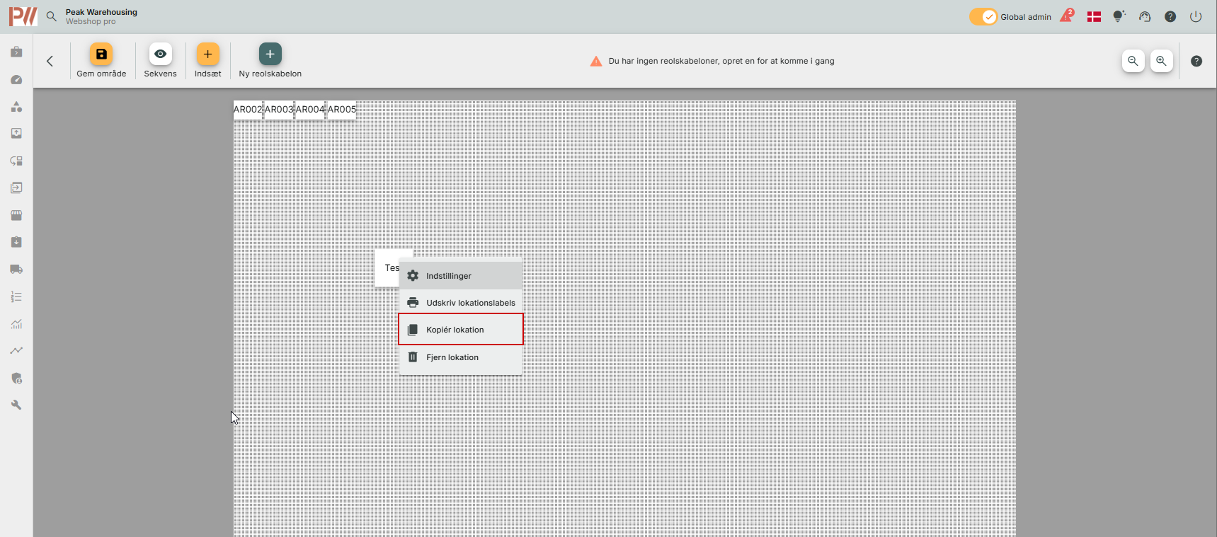 OBS! Funktionen er kun tilgængelig for kopiering af gulvlokationer. Det er ikke muligt at kopiere reoler på denne måde. Her henvises til reolskabeloner i stedet.