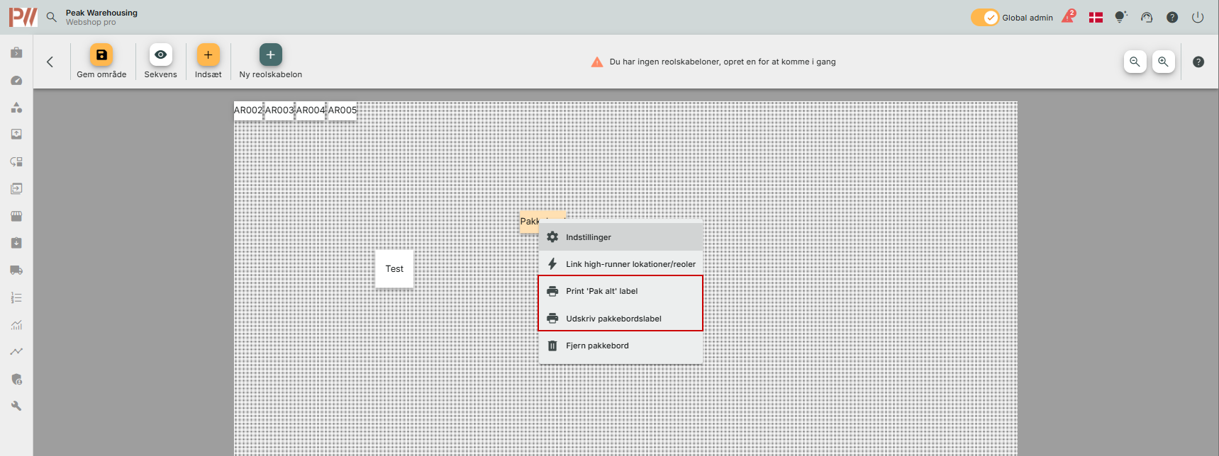 Det er også muligt at printe en "Pak alt" label til dit pakkebord. Denne kan printes både i lageropsætningen og under Admin > Lager > Pakkebord, ved at klikke på tre prik menuen ud for pakkebordet.