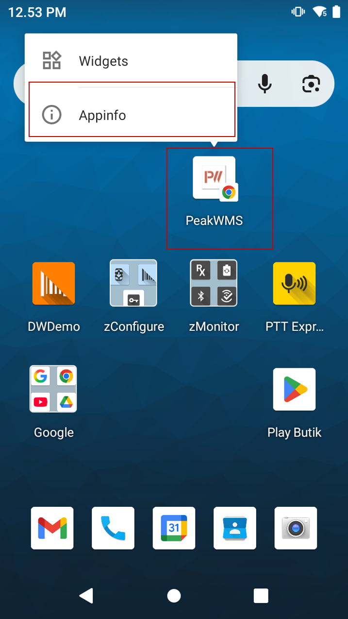 For at gøre dette, skal du holde ikonet for PeakWMS "appen" neden. Her vælger du "Appinfo".