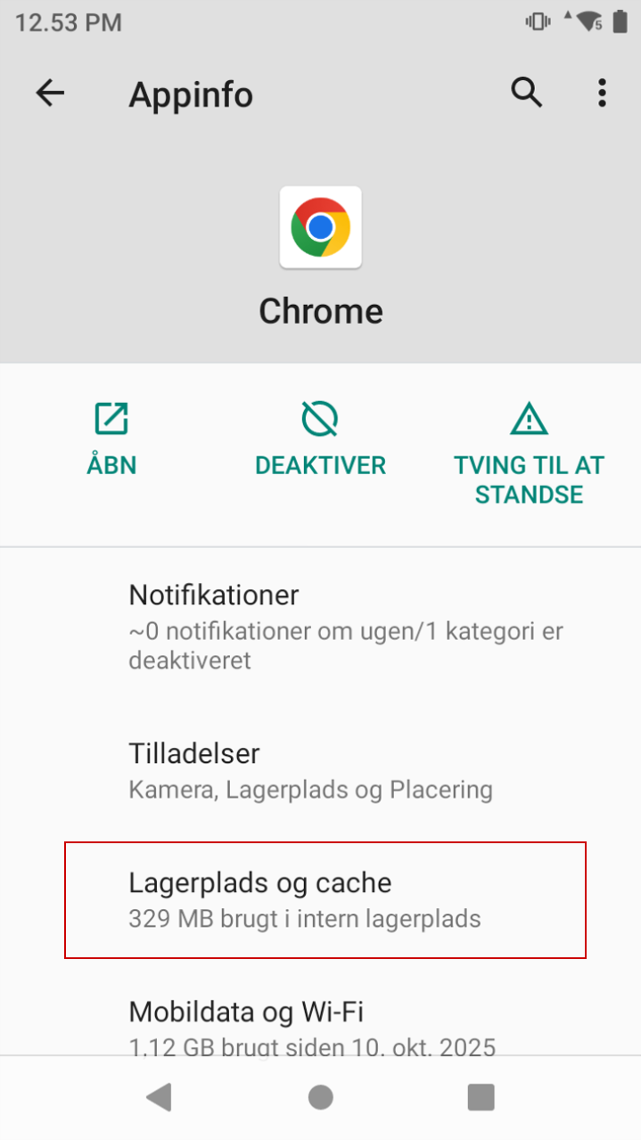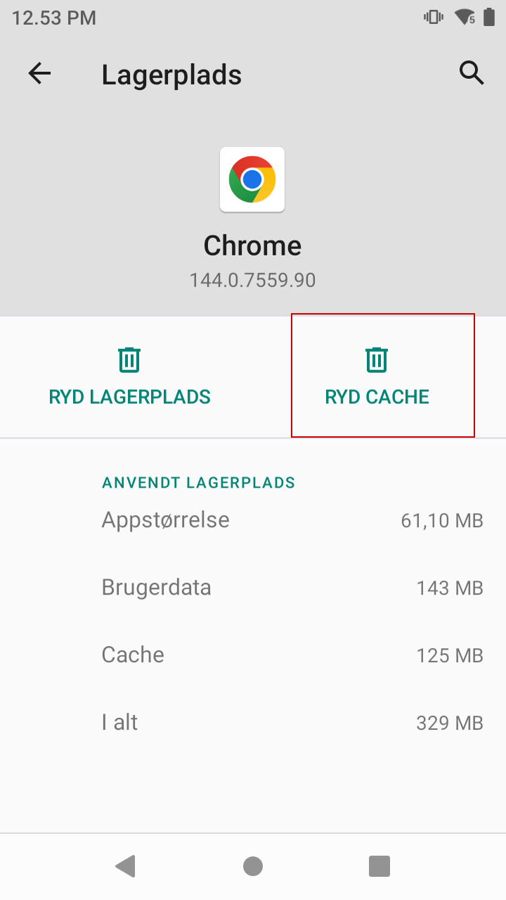 Når du klikker her, får du mulighed for at "Ryd lagerplads" og "Ryd cache". Her vælger du "Ryd cache".