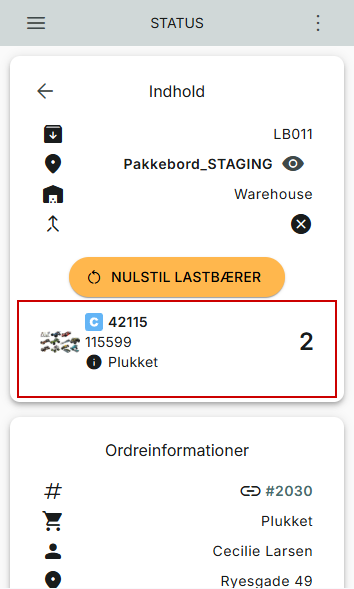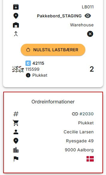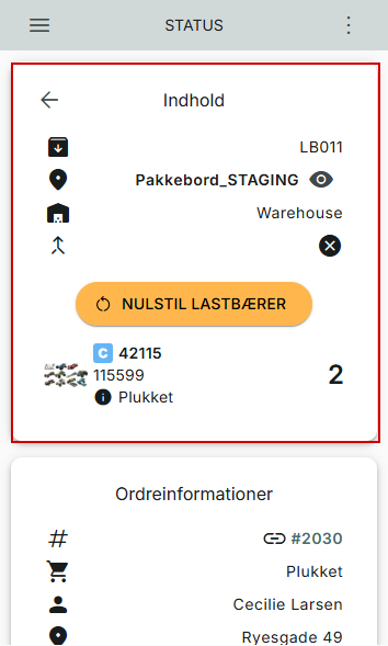 OBS! Er der registreret en ordre, og ligger der varer i status “Plukket” i lastbæreren, er det ikke muligt at nulstille lastbæreren. Her viser PeakWMS en fejlbesked der forklarer, at lastbæreren indeholder varer og en ordre i status plukket, og at lastbæreren skal scannes i pakkeprocessen, for at afslutte ordren korrekt.