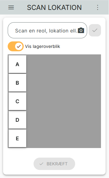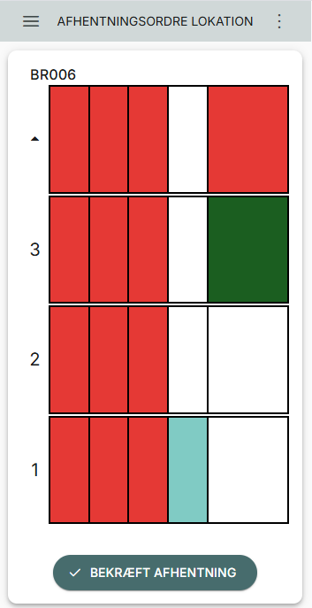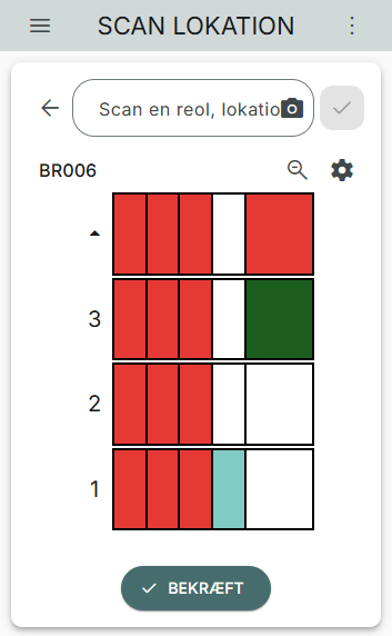 Du scanner en reol på lageret og vælger en lokation i reolen, som ordren skal ligge på. Lokationen du klikker på markeres med grøn. Du skal bekræfte lokationen, for at registrere ordren på lokationen.