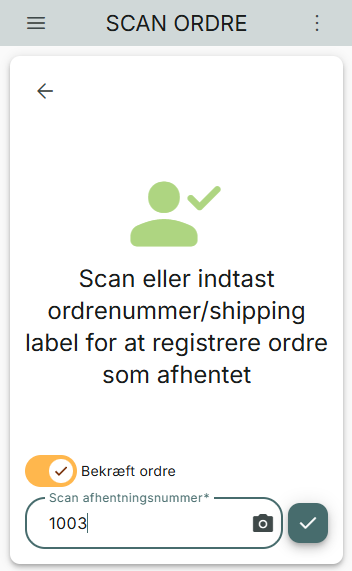 Når ordren scannes her, sendes der besked til shoppen om, at ordren er afleveret, og at betaling for ordren kan trækkes. Går betalingen igennem, vises dette i bunden af skærmen med en grøn bjælke.