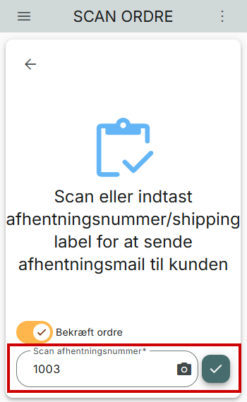Når du scanner ordren klar til afhentning, skal du bruge afhentningsnummeret, der ligger på ordren. Du kan scanne afhentningslabel for at registrere ordren under Værktøjer > Afhentning > Klar til afhentning.