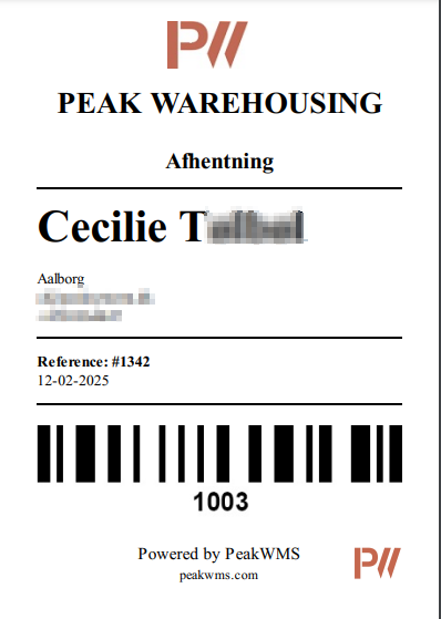 Afhentningsnummer tilføjes automatisk til den afhentningslabel, der printes via PeakWMS, når ordren pakkes.