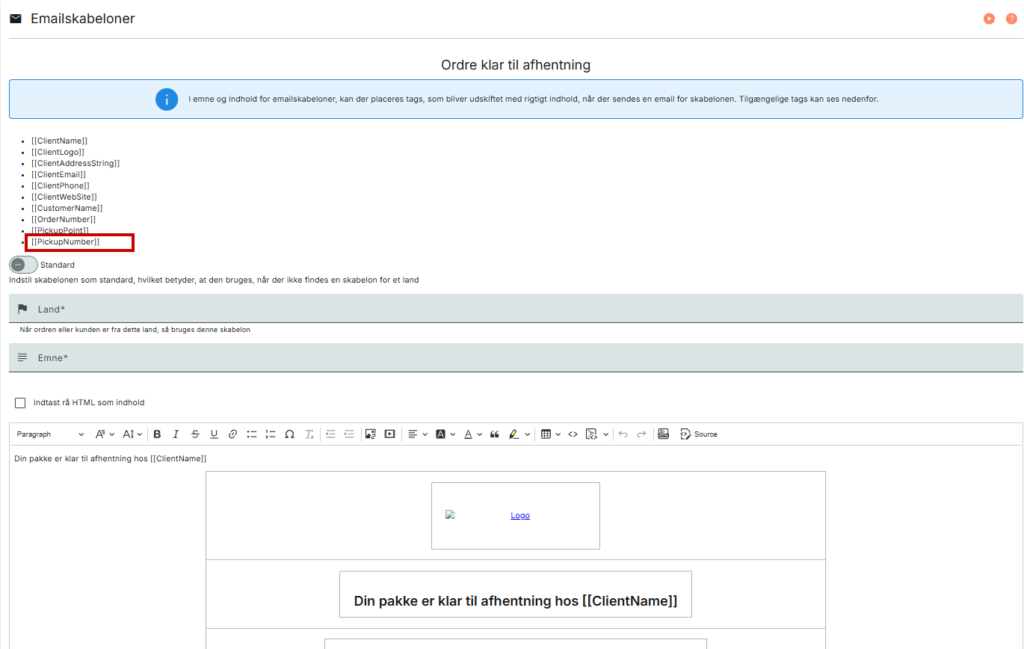 Afhentningsnummeret skal tilføjes til jeres emailskabelon for “Ordre klar til afhentning”. Tagget markeret på billedet, skal tilføjes til emailskabelonen, for at afhentningsnummeret tilføjes til emailen, som kunden modtager.