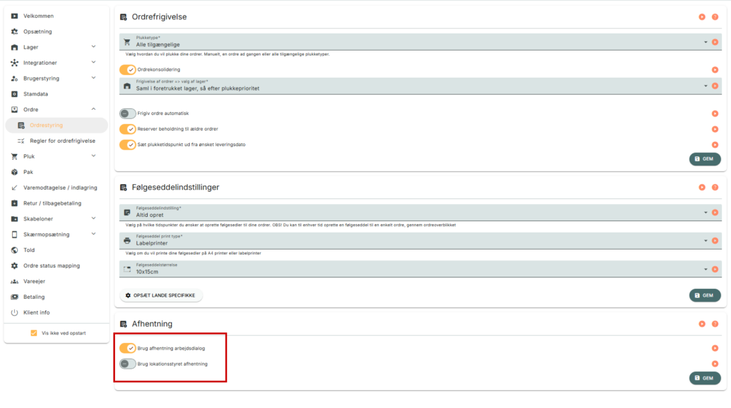 Benytter du afhentningsflowet "Scan klar til afhentning" i PeakWMS, kan du slå funktionen for lokationsstyring til i flowet. Funktionen slåes til under Indstillinger > Ordre > Ordrestyring, under punktet “Afhentning”.