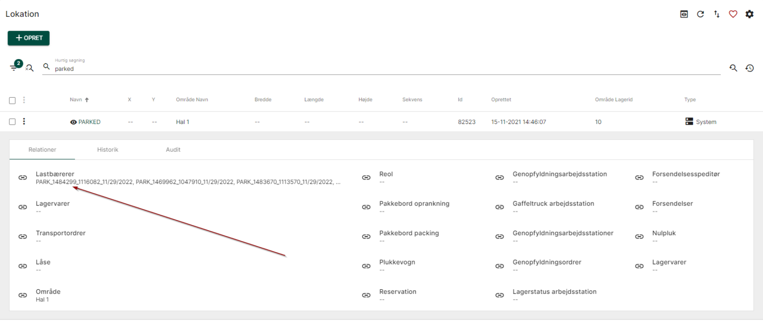Er du i tvivl om, om du har ordrer registreret på PARKED, kan du søge efter PARKED i Admin > Lager > Lokation. Når du klikker på linjen for PARKED-lokationen, vil du kunne se parkerede ordrer registreret på lokationen under feltet Lastbærere.