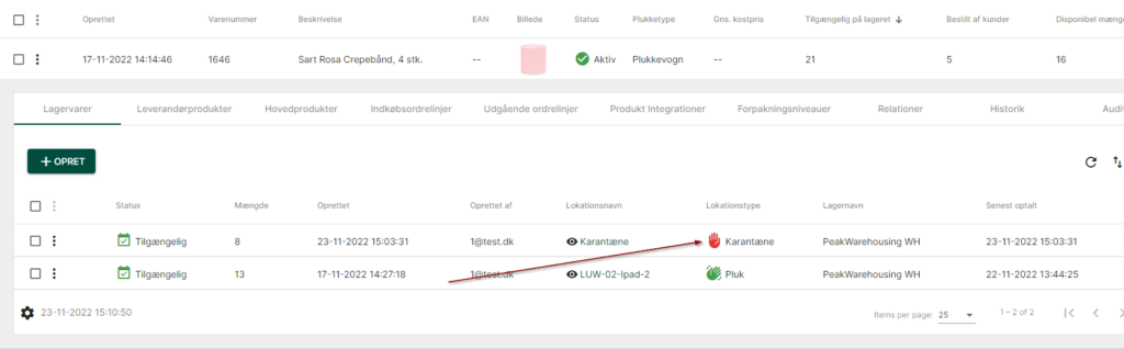 Beholdninger, der ligger på en lokation af typen "Karantæne" er låst. Det betyder, at det ikke er muligt at plukke varer eller foretage genopfyldninger fra lokationen. Beholdningen, der ligger på karantænelokation indgår ikke i antal til salg på webshoppen (hvis flag på lokationen er sat).