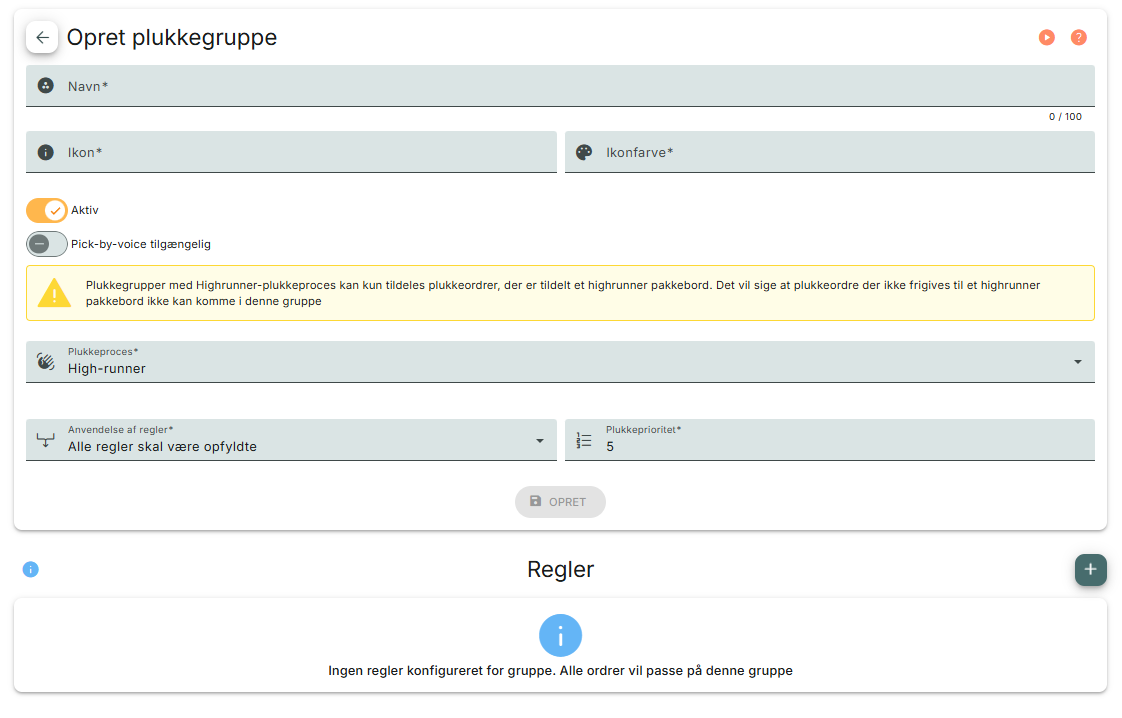 Du kan opsætte highrunner plukkegrupper på samme måde, som du opsætter øvrige plukkegrupper med regler og kriterier, for at opdele dine highrunner-ordrer, så de matcher plukkegrupperne.