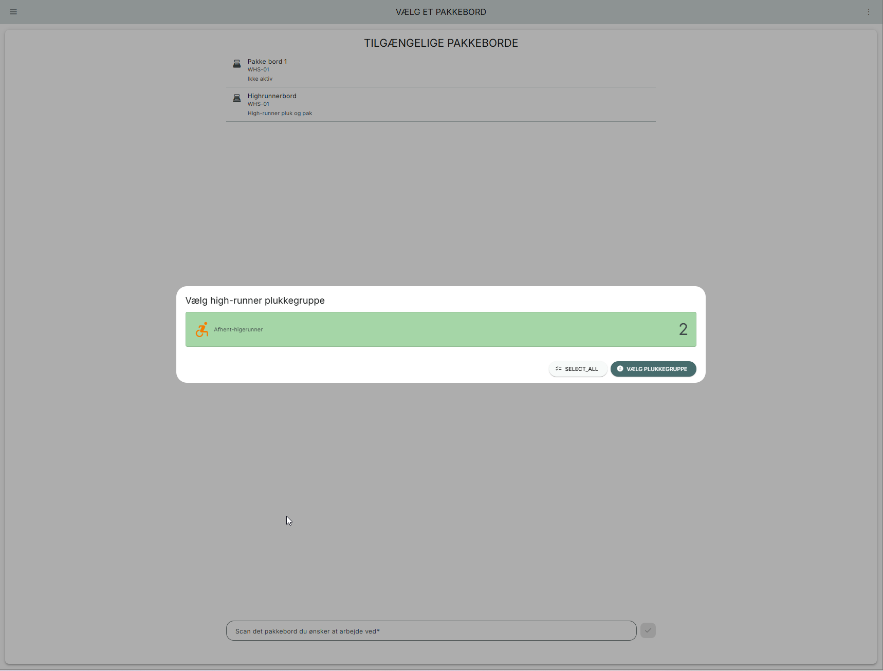Når du tilgår highrunner-pakkebordet, vil du få vist dine aktive highrunner-plukkegrupper. Disse vises i en pop up på skærmen. Du vælger en plukkegruppe, for at få tildelt de ordrer, der ligger i gruppen. Du kan vælge én eller flere plukkegrupper ad gange. Du har også mulighed for at tage alle highrunner-ordrerne på samme tid.