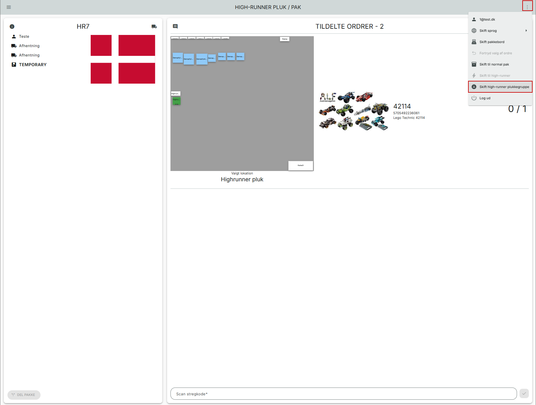 Du har mulighed for at skifte plukkegruppe. Dette gøres ved at klikke på tre prik-menuen øverst til højre og vælge "Skift highrunner plukkegruppe". Klikker du her, genåbnes pop up'en med valg af plukkegruppe.