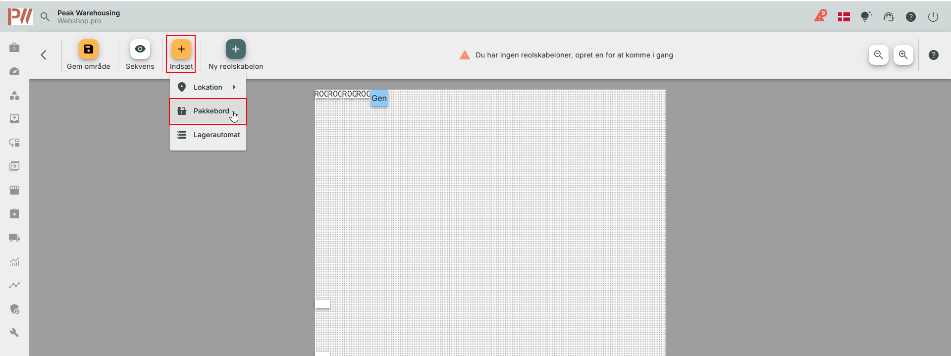 Du opretter et pakkebord under Indstillinger > Lager > Lageropsætning. Her tilgår du området som pakkebordet skal være i, klikker på "Indsæt" og vælger "Pakkebord".