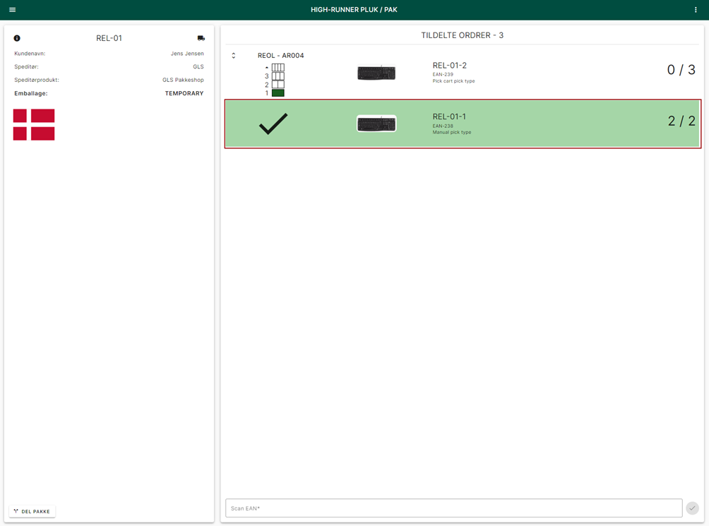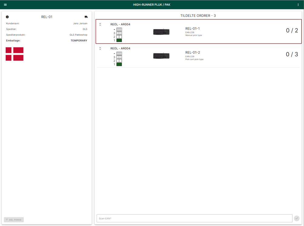 Når du har valgt en plukkegruppe, tildeles du automatisk en ordre, der ligger i plukkegruppen. På skærmen får du vist lokationen, de skal plukkes fra, produktet, der skal plukkes og mængden, der skal plukkes. Til venstre i skærmen kan du se, hvilken ordre, du er igang med at plukke/pakke.