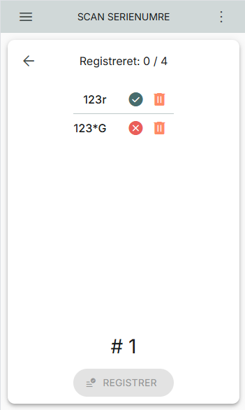 Serienummer nummer 2, der er registreret er markeret med et rødt kryds. Det betyder, at serienummeret ikke kan valideres, da det ikke matcher den regex, der er opsat.