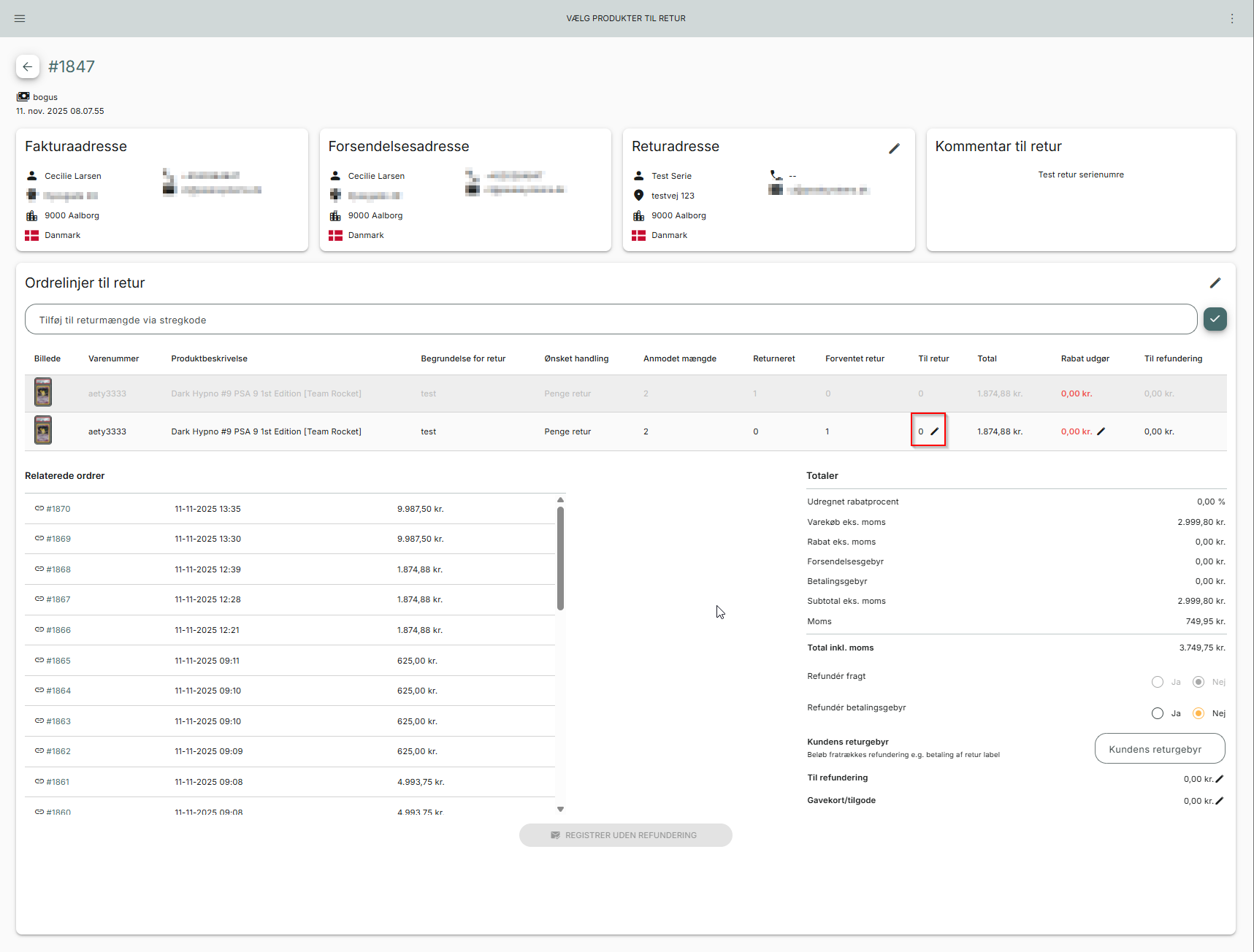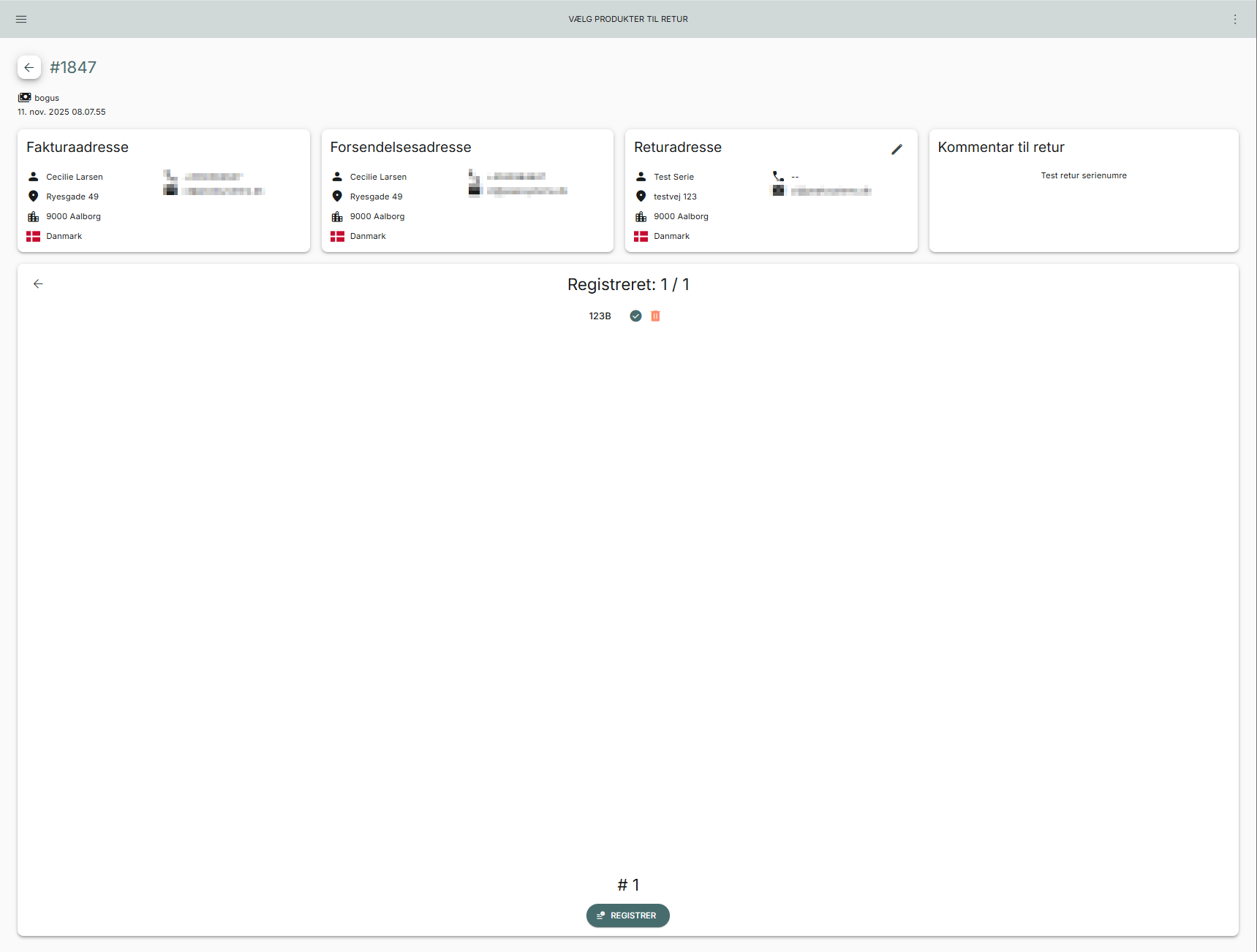 Registrering af serienummer i retur