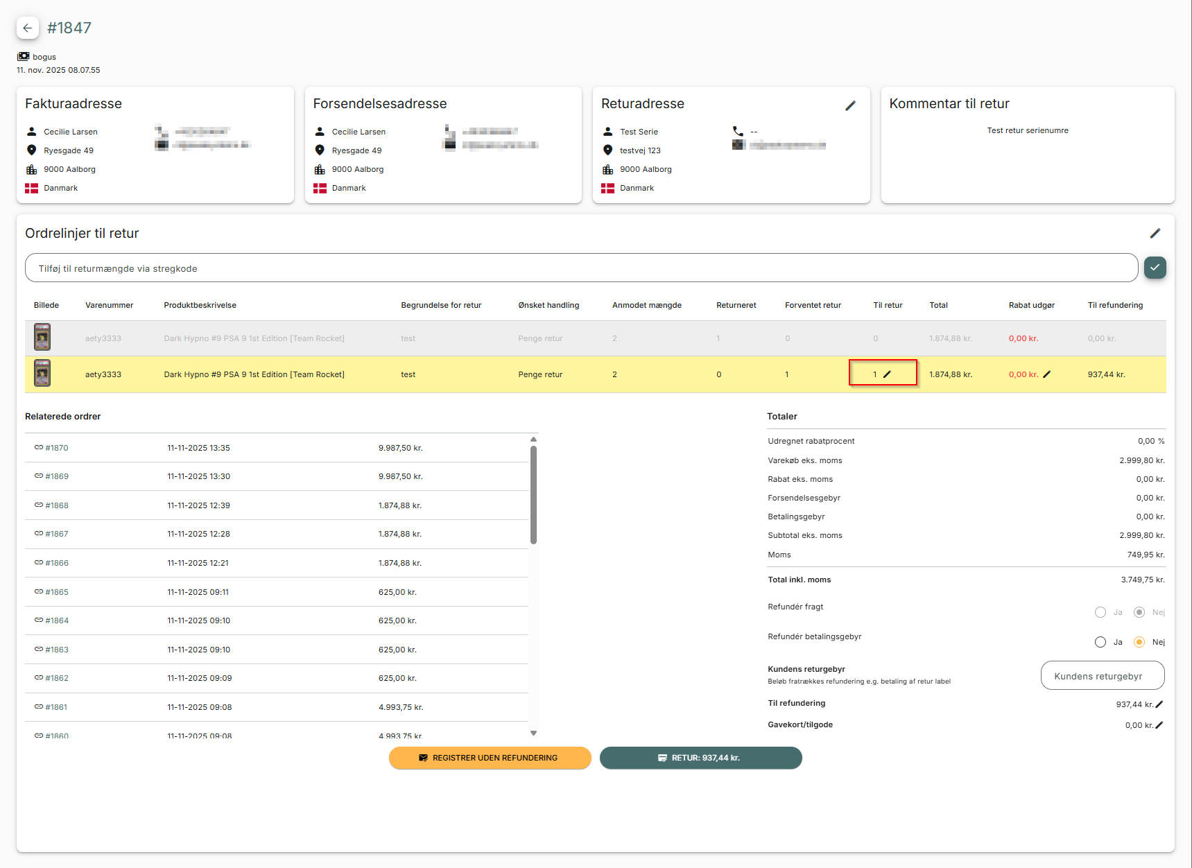 Når returen gennemføres, splittes returordrelinjerne ud på egne linjer med serienummer tilknyttet.