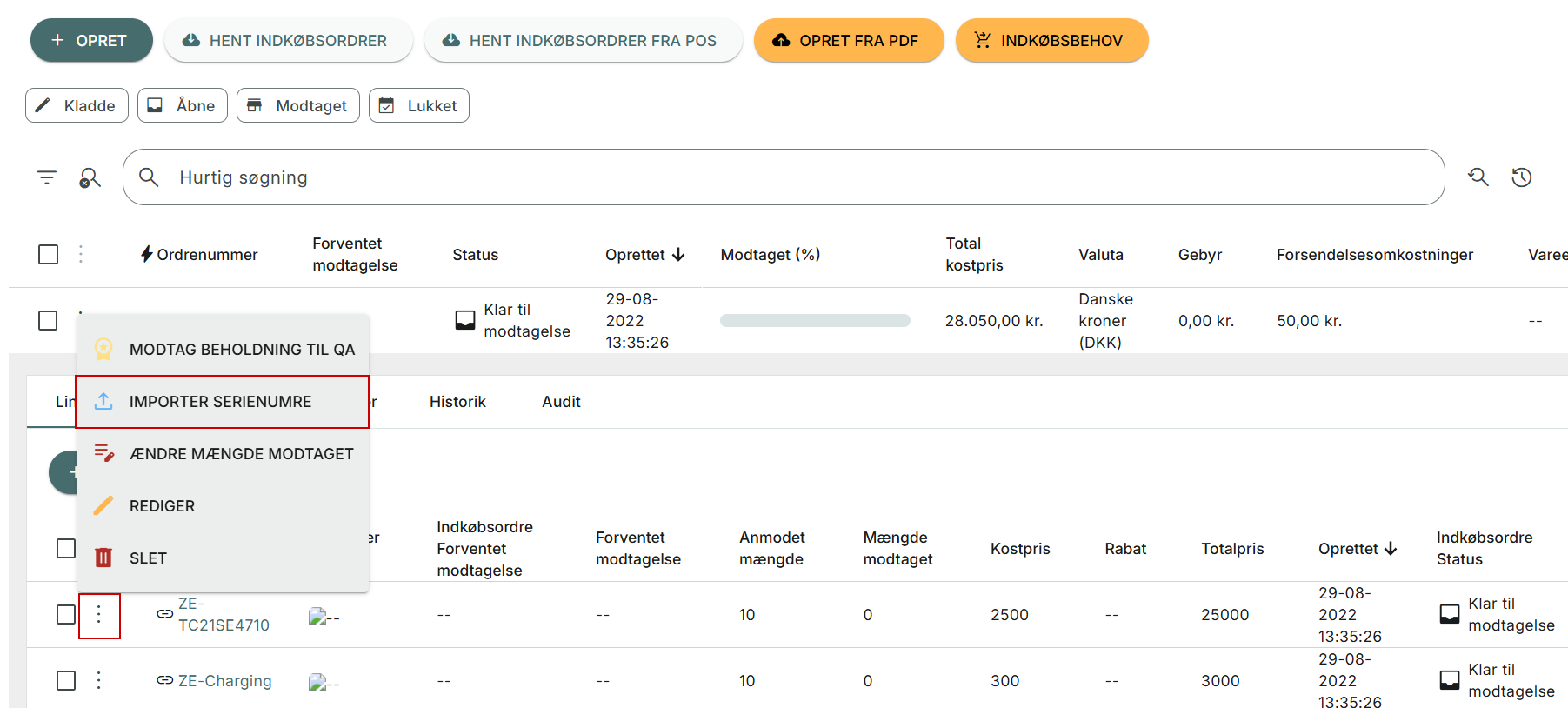 Du importerer serienumre, ved at folde en indkøbsordre ud, og klikke på tre prik menuen ud for indkøbsordrelinjen, der skal importeres serienumre til. Her vælger du "Importér serienumre: