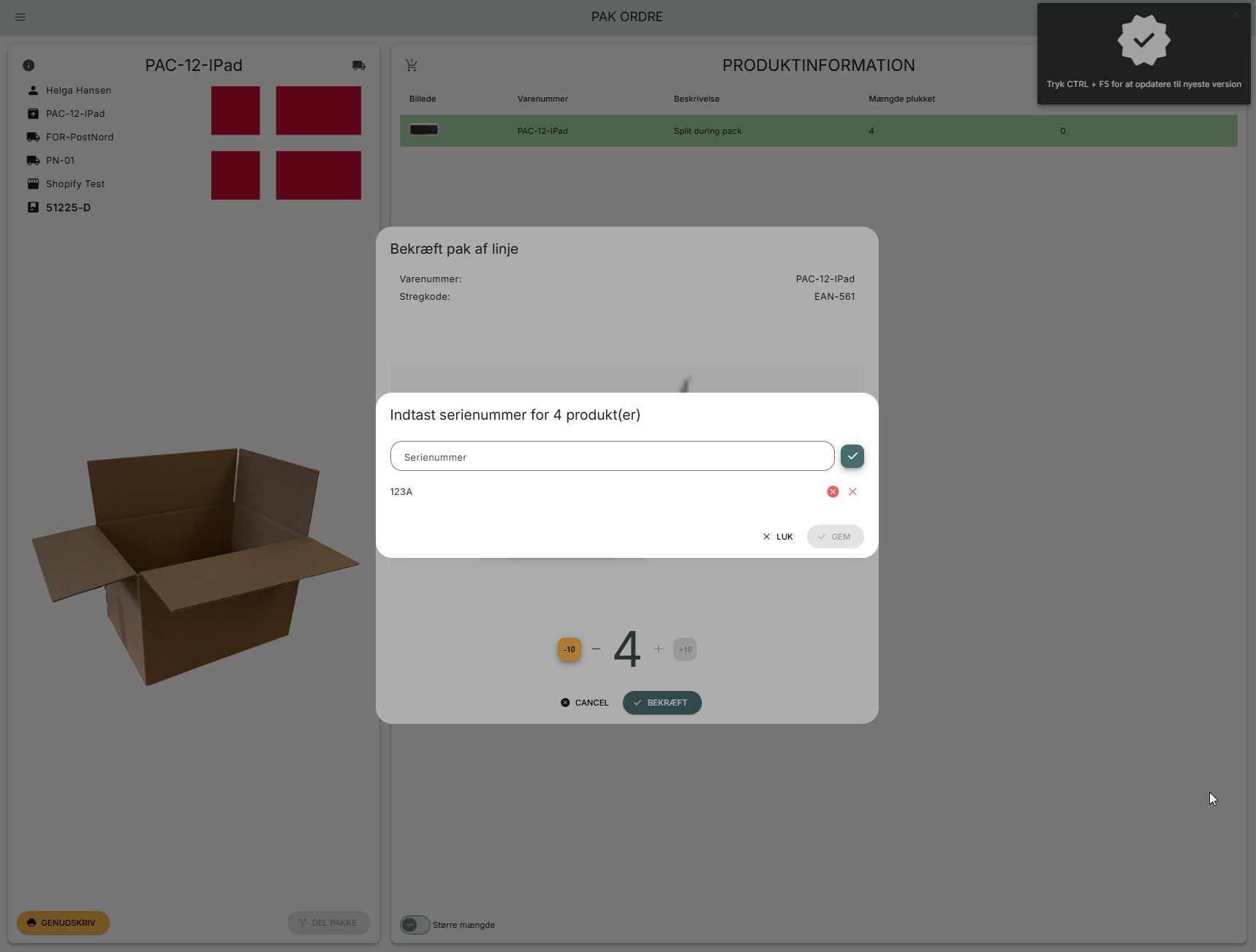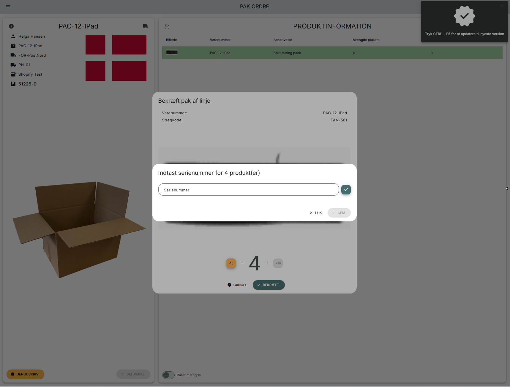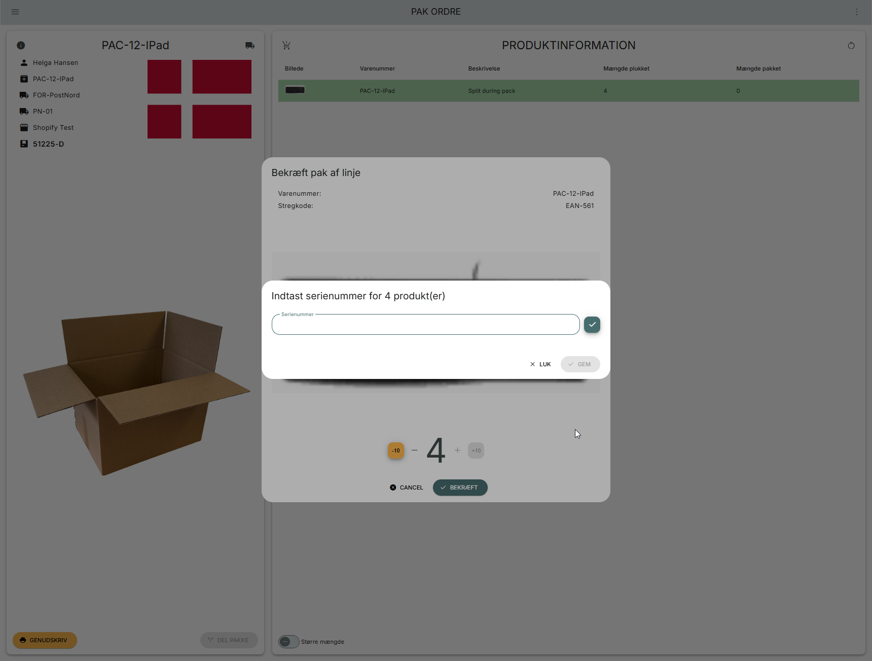 Nå du scanner en stregkode eller klikker på en ordrelinje, for at pakke den, viser PeakWMS en pop up, hvor du skal indtaste serienummer for varen du vil pakke.