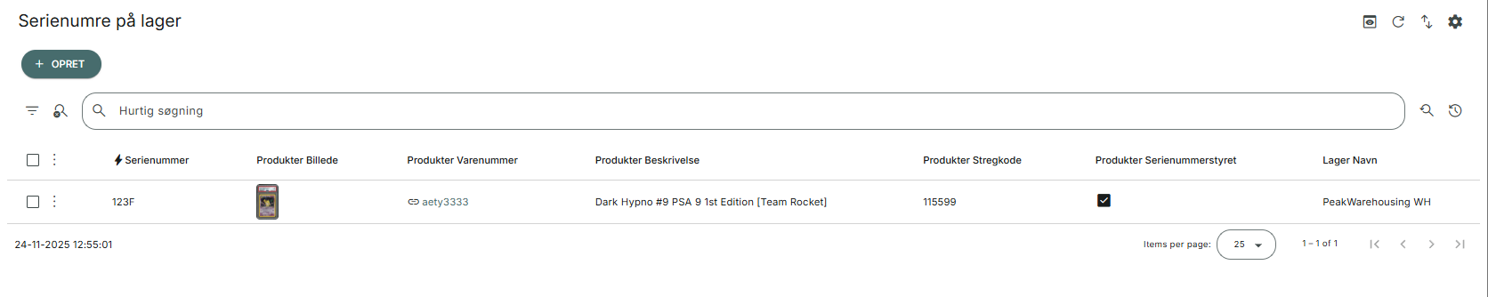 Det første serienummer, der er registreret er markeret med et flueben. Det betyder, at serienummeret er valideret og matcher det format, der er sat i regex for produktet.