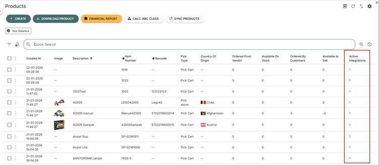 The field is called “Active integrations” and must be added via table settings in the Products dialog.