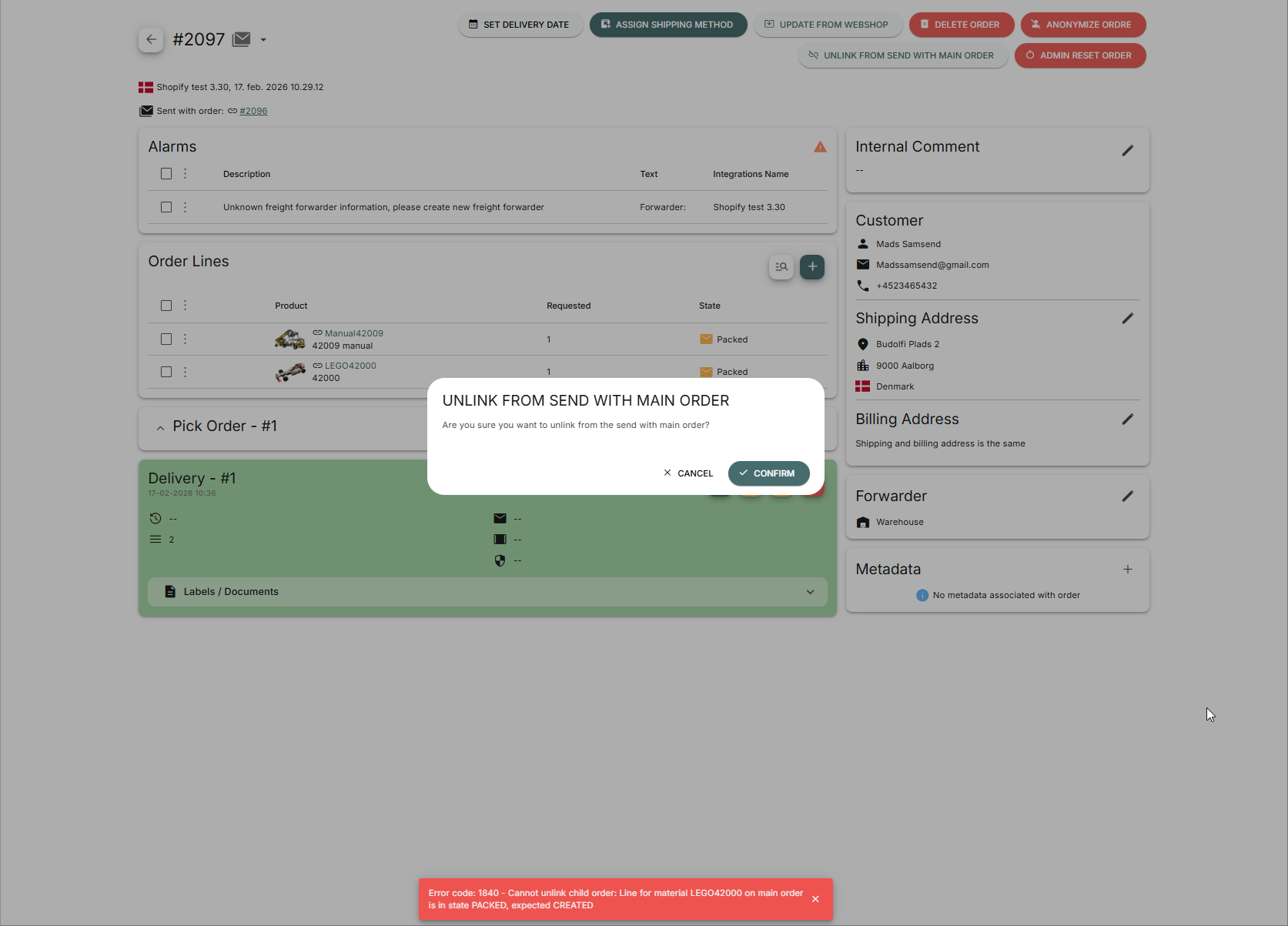 If you attempt to unlink an order that has already been picked or packed, you’ll see an error stating that it is not possible to unlink the order.