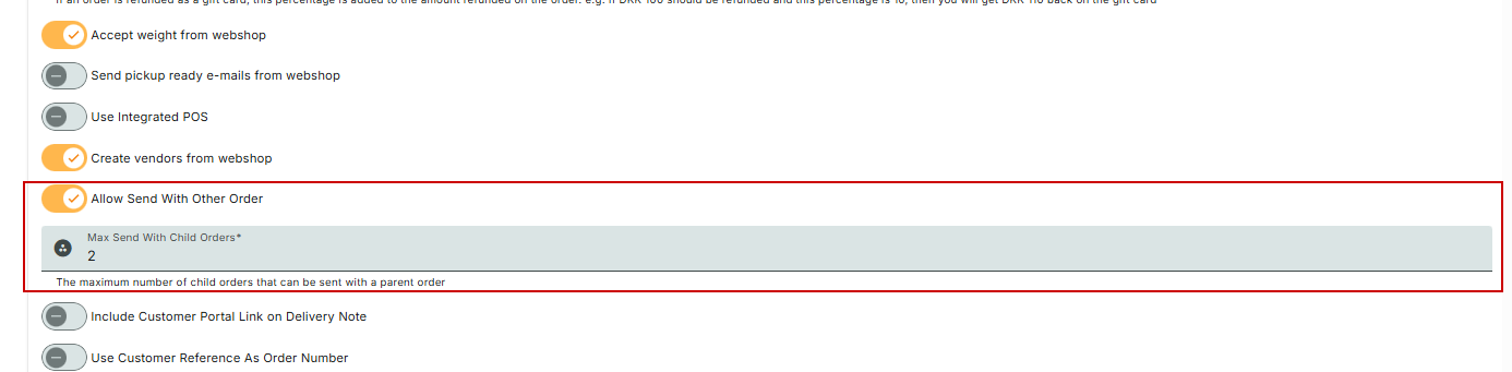In the webshop integration under Settings > Integrations > Webshop Integration, you can now specify a max number of child orders that can be linked to a main order for consolidated shipping.