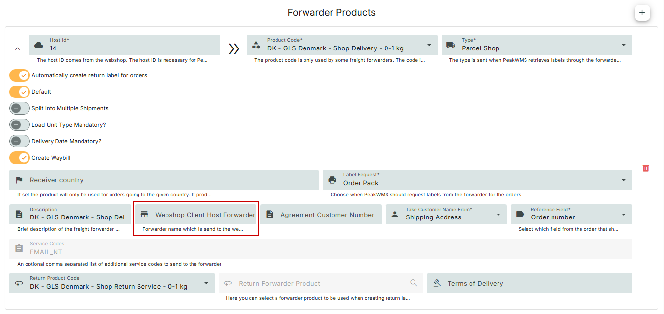 You can find the field by expanding the forwarder product in Settings. The field is called “Webshop client host forwarder name”. You must ensure that the forwarder name in this field matches the forwarder name Shopify expects.