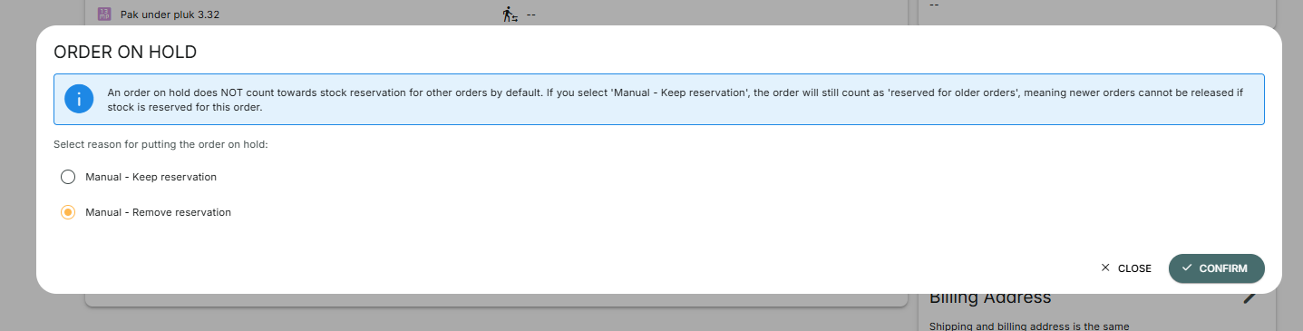 When you click “Order on hold”, you will now be presented with a screen where you must choose whether to keep or remove the reservation.